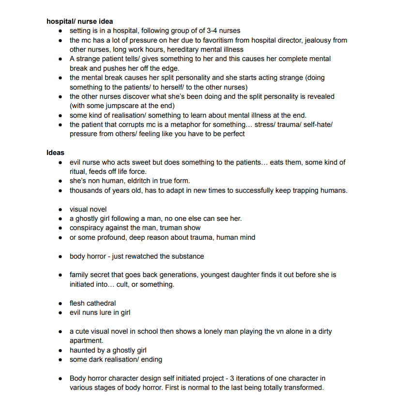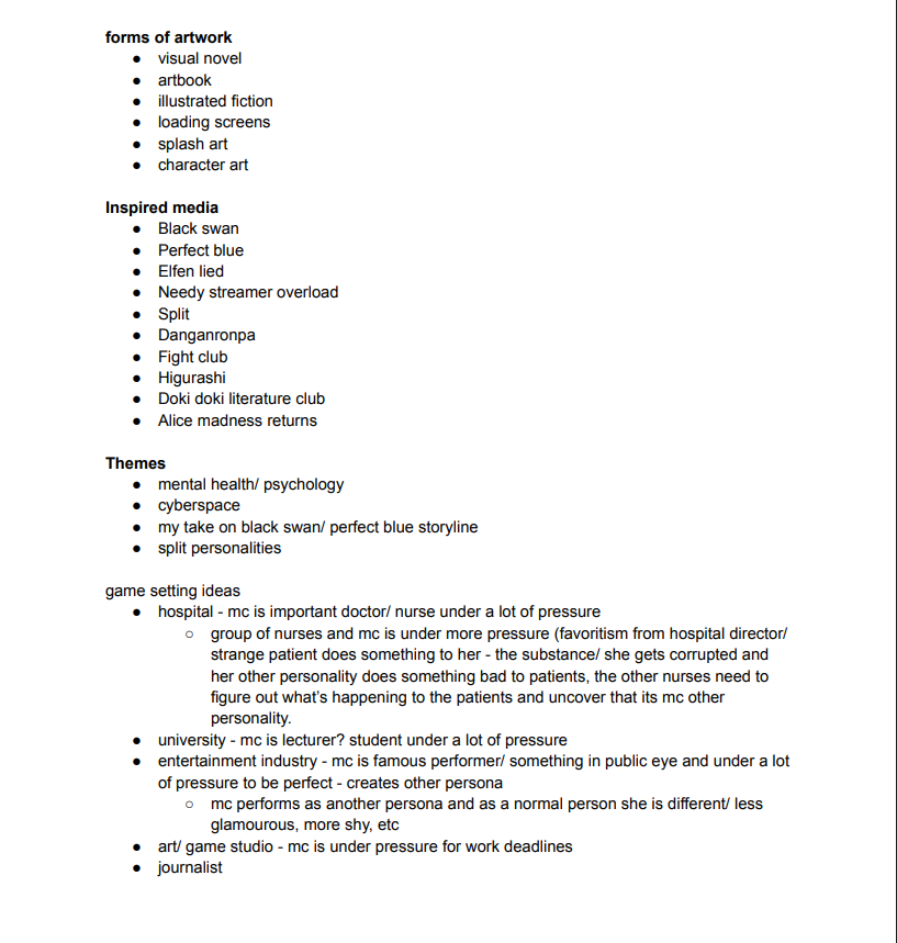 so by the end of the first week I was sure I wanted to create a 2D visual novel for my FMP, I was also sure I wanted it to be of a horror theme. the rest was just continuing on my general ideas generation and inspirations for my project. this was a great start to my final year at uni! and I was enjoying going back to class again after having DPS and not attending my regular games art classes. also being given the freedom to create anything that I want for my final project was super excited and helped to motivate me!!